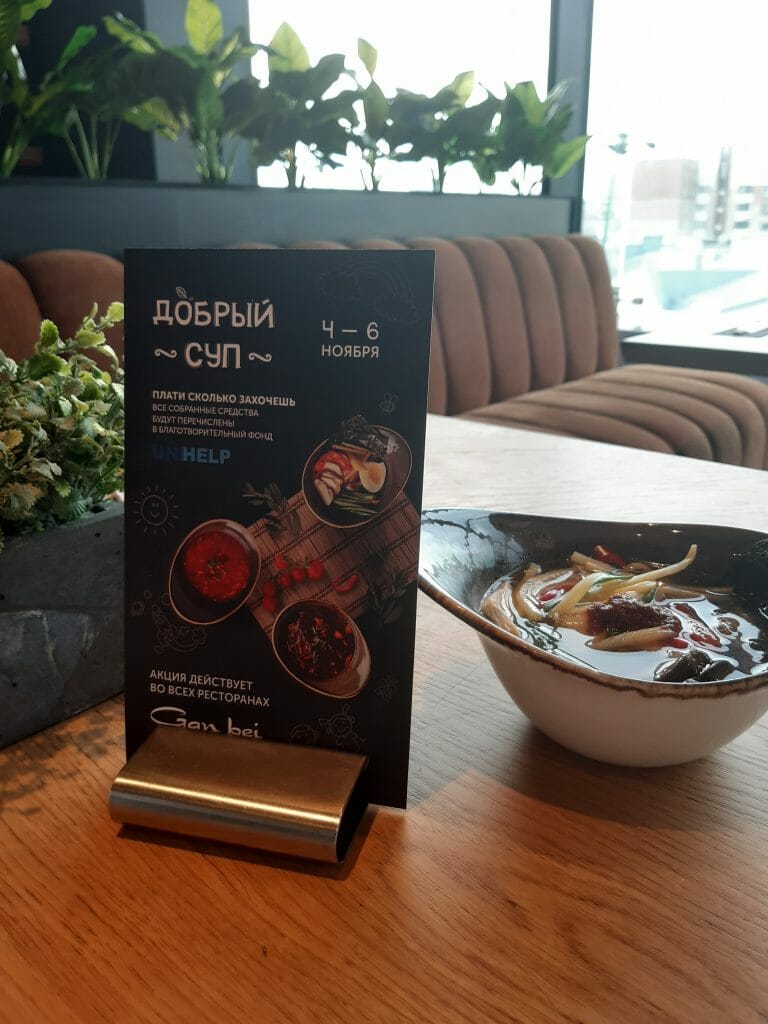 “Наш ресторан работает по высоким стандартам и всегда руководствуется правилом: “каждый гость должен быть доволен”, поэтому для “Доброго супа” мы решили сделать что-то особенное. Наши лучшие повара, выходцы из Индии, разработали специальное меню: “Рамэн с курицей”, “Томатный суп с креветками и древесными грибами” и “Кисло-острый суп с морским окунем”. Так мы хотим привлечь как можно больше людей к добрым делам”, — рассказывает Иванов Сергей, управляющий рестораном Gan bei.