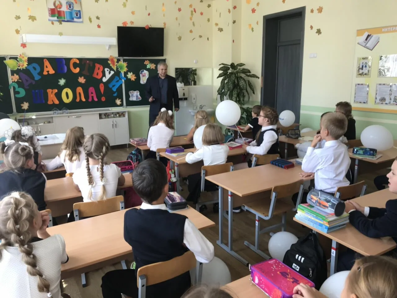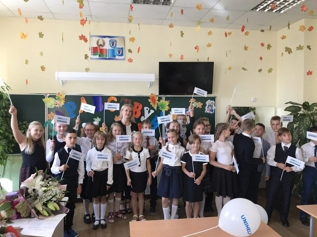 4 «А» класс одной из школ Минска поддержал замечательную традицию — делать добрые дела вместо покупки обычных букетов.  2 сентября на школьной линейке ребята держали в руках шарики и флажки UNIHELP. После линейки ребята собрались на классном часу, чтобы послушать  лекцию»Человек умеет помогать». Выступление провел заместитель председателя правления UNIHELP Владислав Иванский.  Он рассказал ребятам о деятельности UNIHELP , наших подопечных, обсудил с учениками вопросы благотворительности, помощи и милосердия.