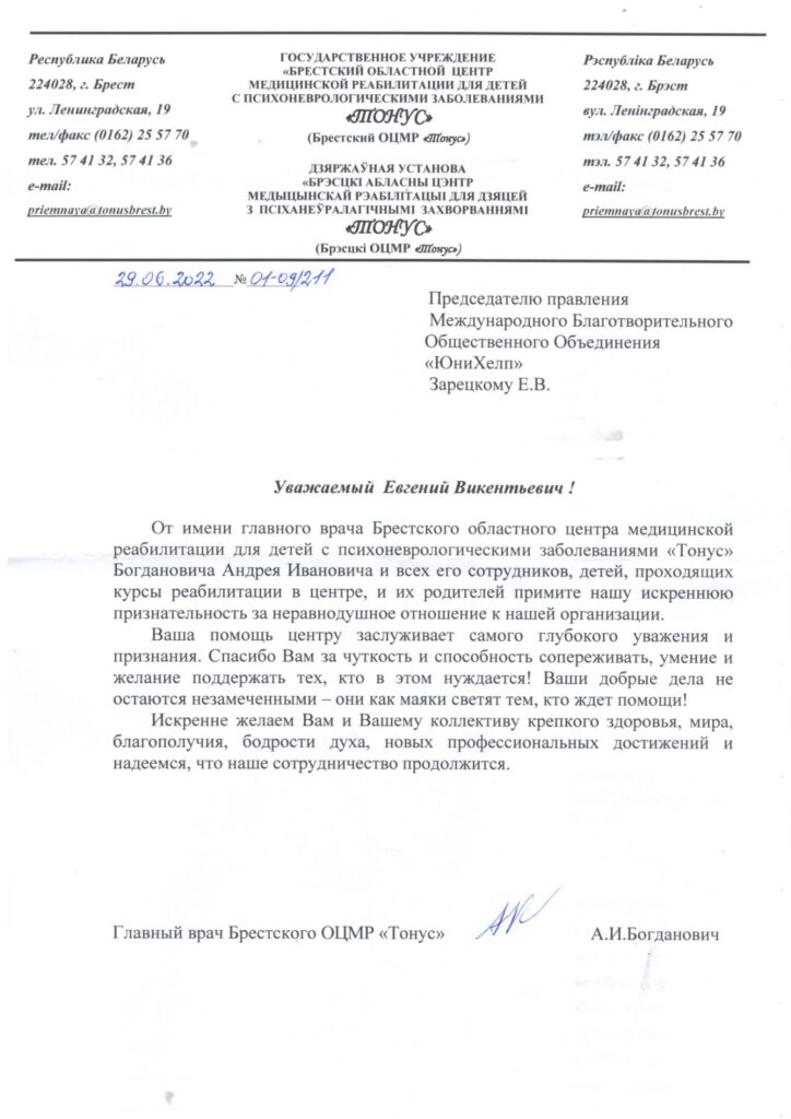 Итоги помощи Брестскому ОЦМР «Тонус»