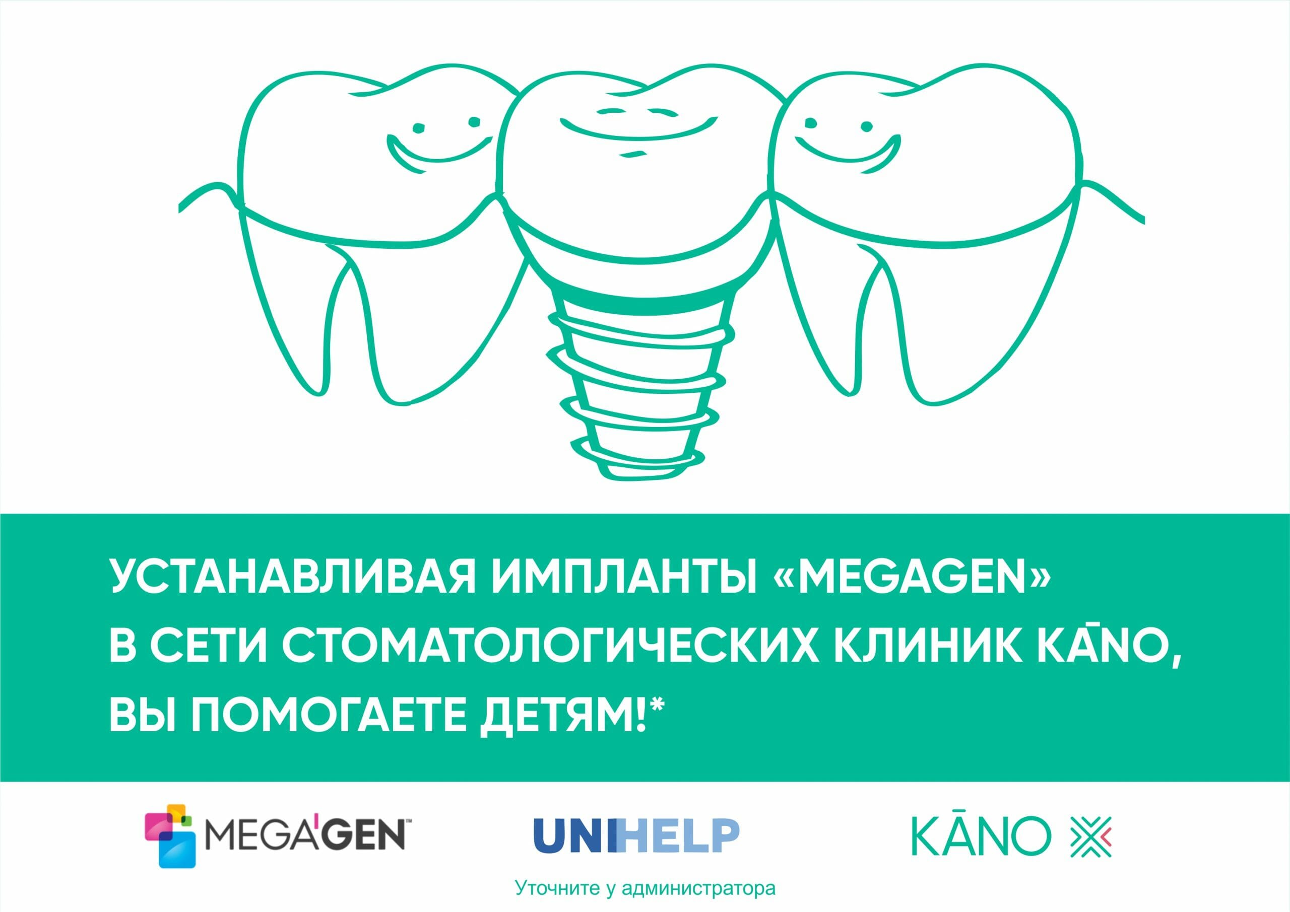 Устанавливая дентальные имплантаты MEGAGEN в сети стоматологических клиник KANO, вы совершаете доброе дело. Ведь 3% от стоимости каждого имплантата будут перечислены в пользу подопечных UNIHELP: средства пойдут на оплату операций и покупку лекарств для детей с тяжёлыми заболеваниями.