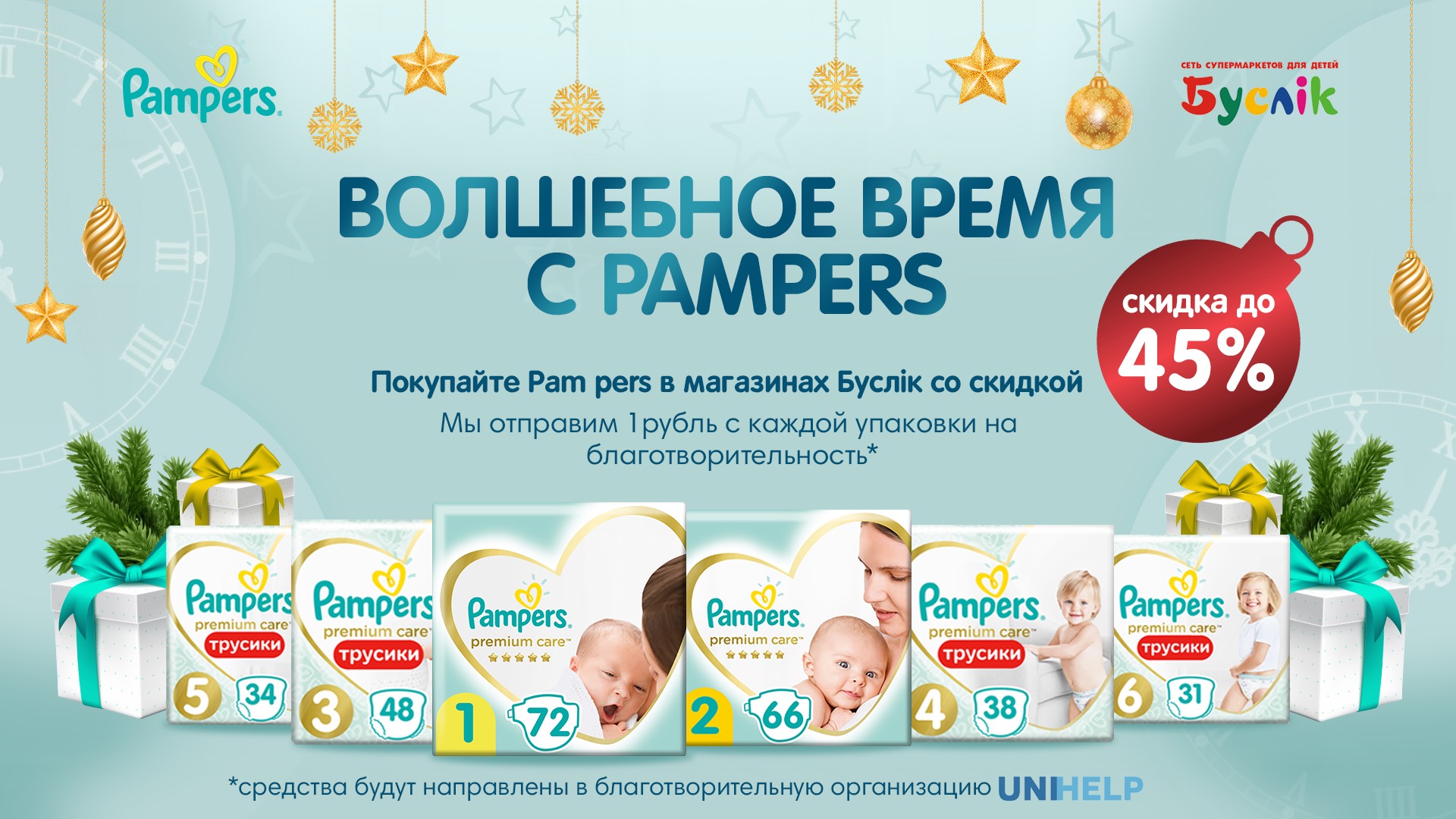 С 15 декабря 2020 по 30 января 2021 года покупая продукцию Pampers, вы будете помогать детям. Ведь каждый рубль с такой покупки пойдет в пользу подопечных UNIHELP.