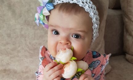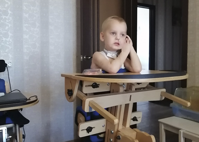 Мальчик становится с каждым днём сильнее: набрал свой прежний вес, может стоять в вертикализаторе и самостоятельно держит шею.